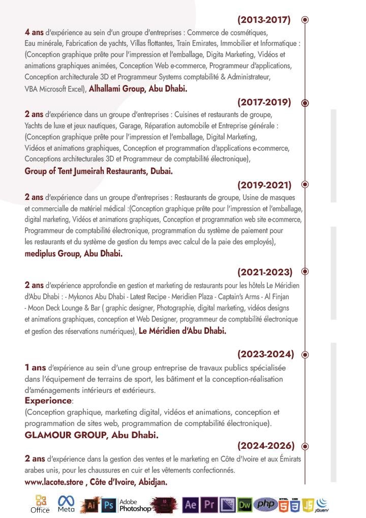 Fort de 19 ans d’expérience internationale, j’accompagne les entreprises dans leur accélération numérique. De la conception d’identités visuelles de marque au déploiement d’écosystèmes web complexes, j’allie maîtrise technique et vision business. Mon parcours aux Émirats Arabes Unis m’a permis d’intégrer une rigueur d’exécution et des standards d’excellence mondiaux, que je dédie désormais au dynamisme du marché ivoirien.